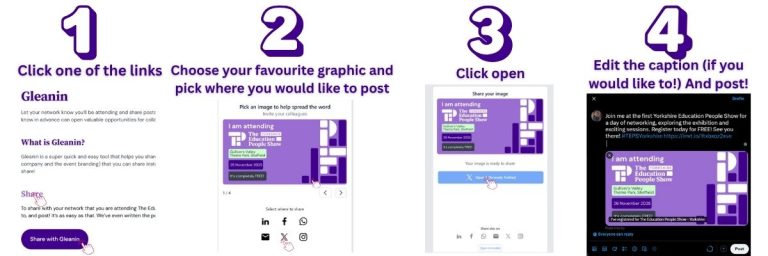 Gleanin is a super quick and easy tool that helps you share your involvement in the event on social media with just a few clicks. It creates a personalised post (with your name, company and the event branding) that you can share instantly to LinkedIn, X (Twitter) or Facebook. No design work or copywriting needed – just click, customise if you like, and share!